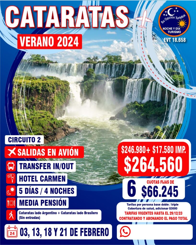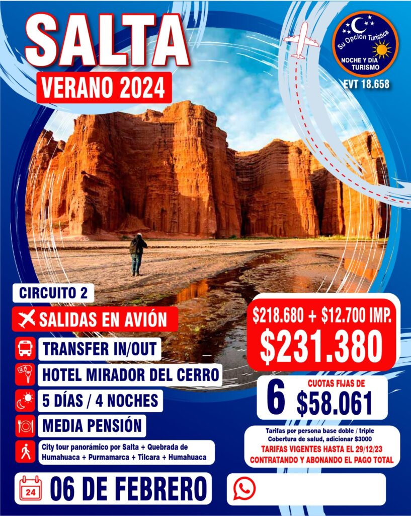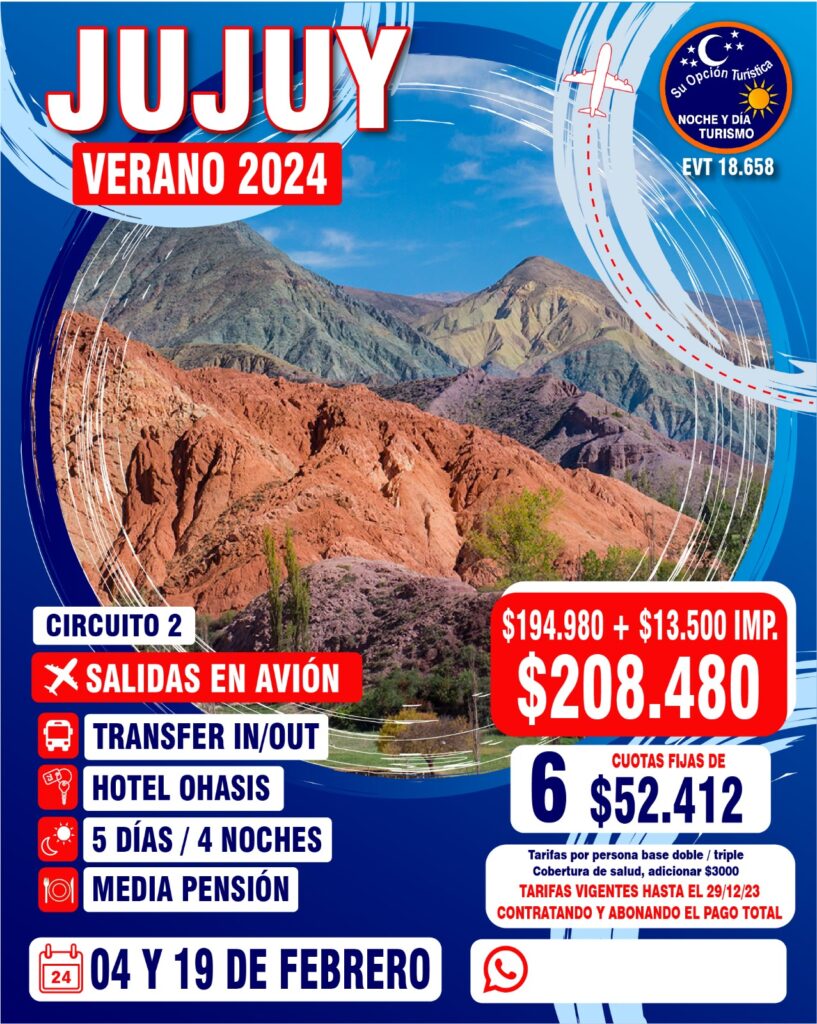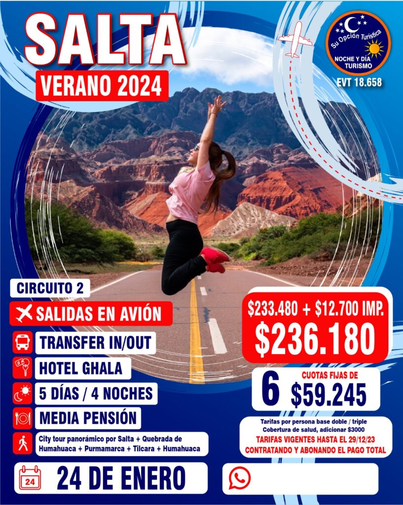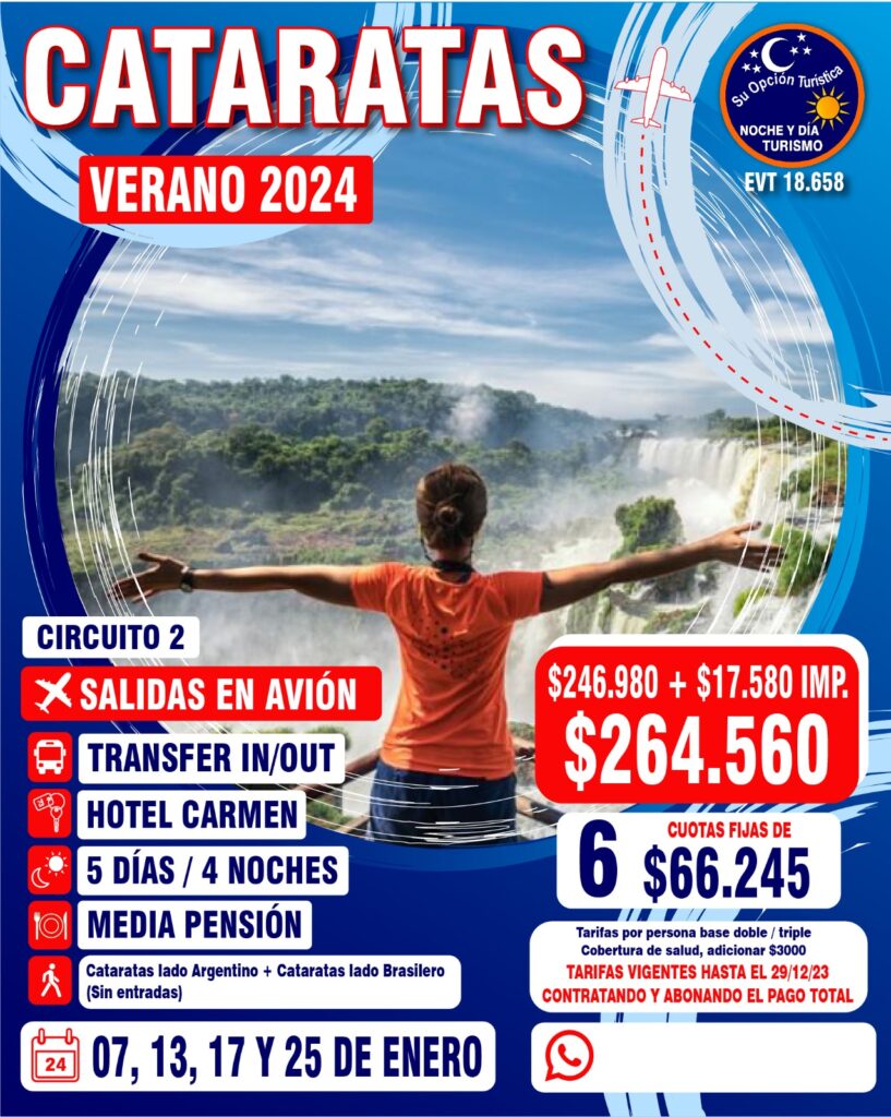VERANO 2024 Circuitos por Argentina Para coordinar todo lo relacionado a los paquetes de excursiones, comunícate con la agencia : Noche y Día WApp (Romina)5491130252040web https://www.nocheydiaturismo.com/Teléfono : (+54) 11 4432 8675E-mail : consultas@nocheydiaturismo.com
